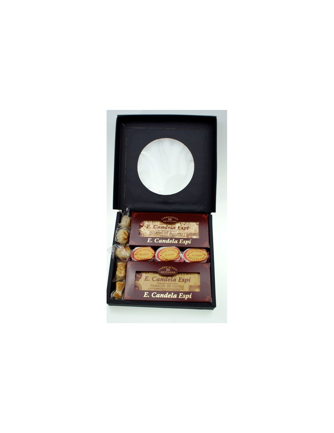 Lote especial artesano presentado en una caja elegante negra y lazo negro y dorado. Contiene: 1 turron de Jijona 300g. 1 turron de Alicante 300g. 1 torta de chocolate con leche o puro 200g. (a elegir) Surtido de polvorones, pasteles de gloria y mazapánes artesanos.