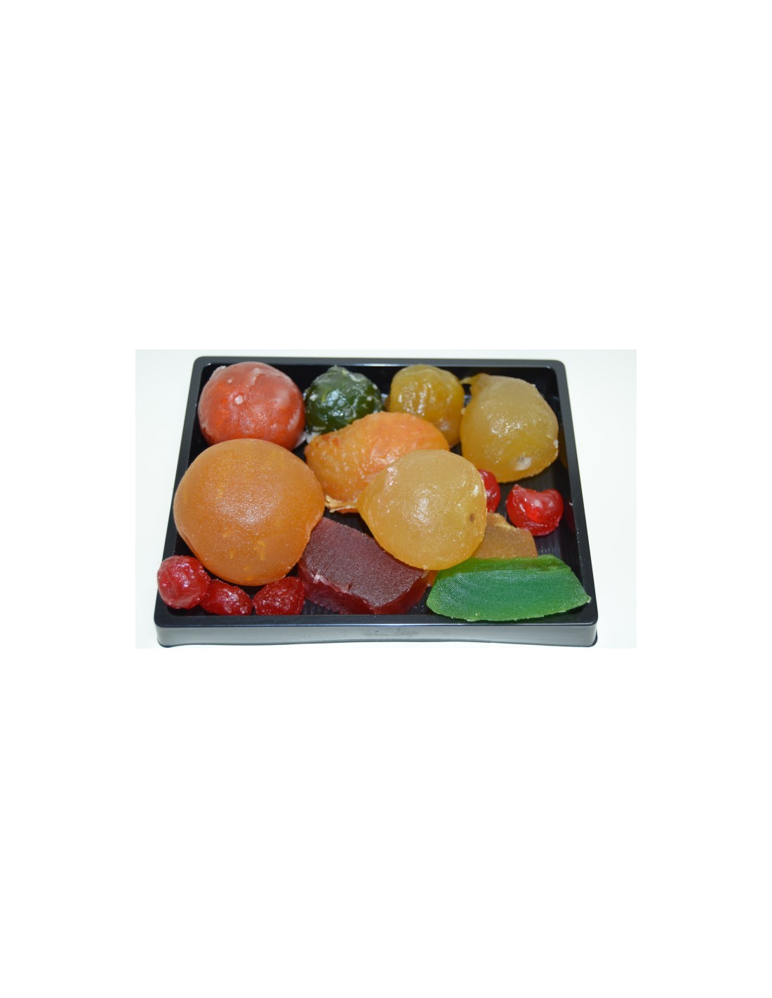 Contiene una proporcion variable de: Naranja en cuartos, albaricoque,melocotn,mandaronas,ciruelas,peras,calabazate,cerezas rojas.