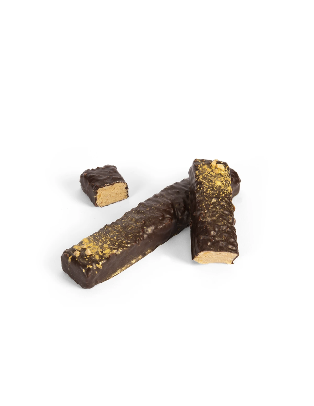 Barra Crujiente Turrón de Jijona y Chocolate Negro, una fusión de almendra marcona, miel de azahar y crujiente barquillo recubierto de cacao 70%.