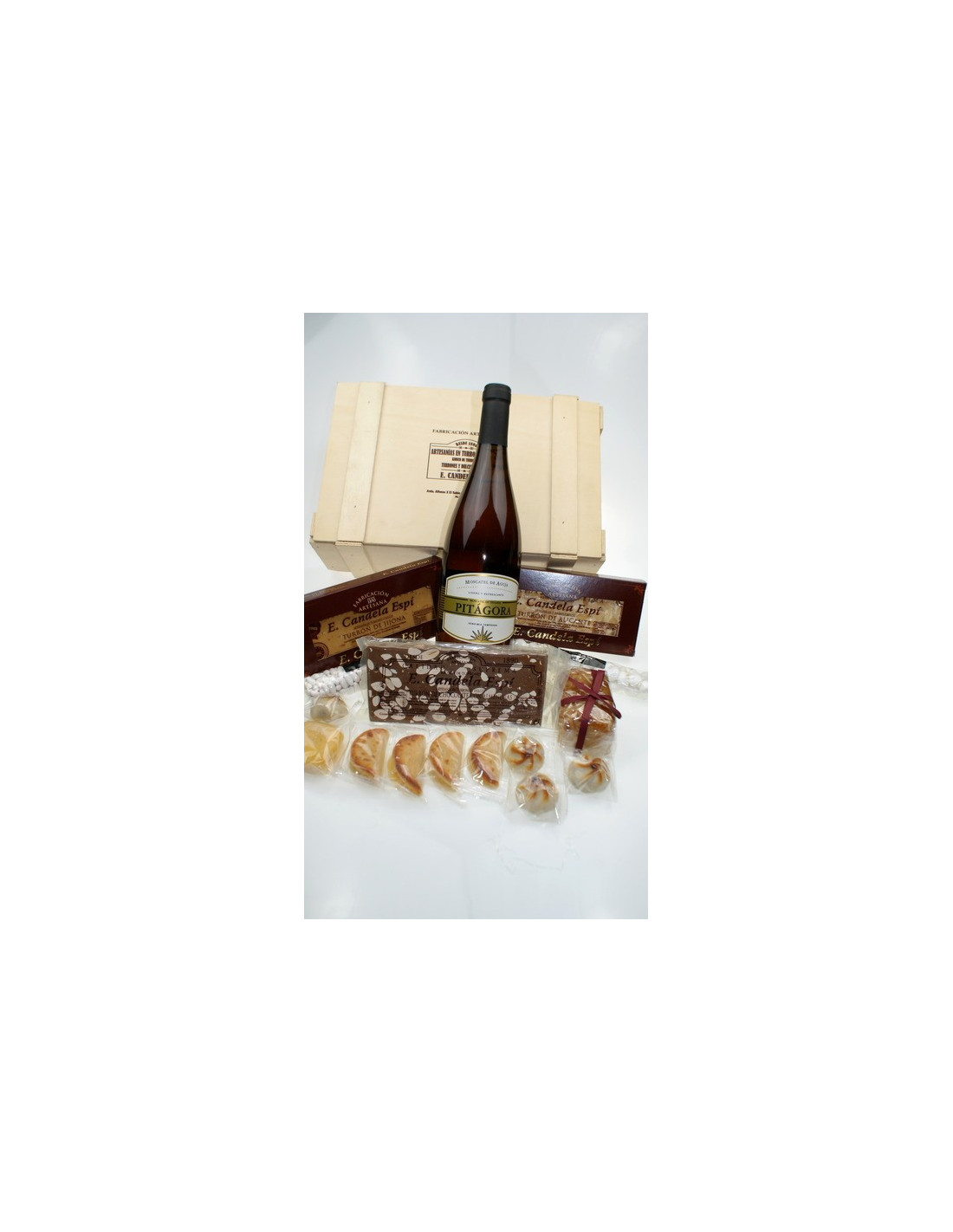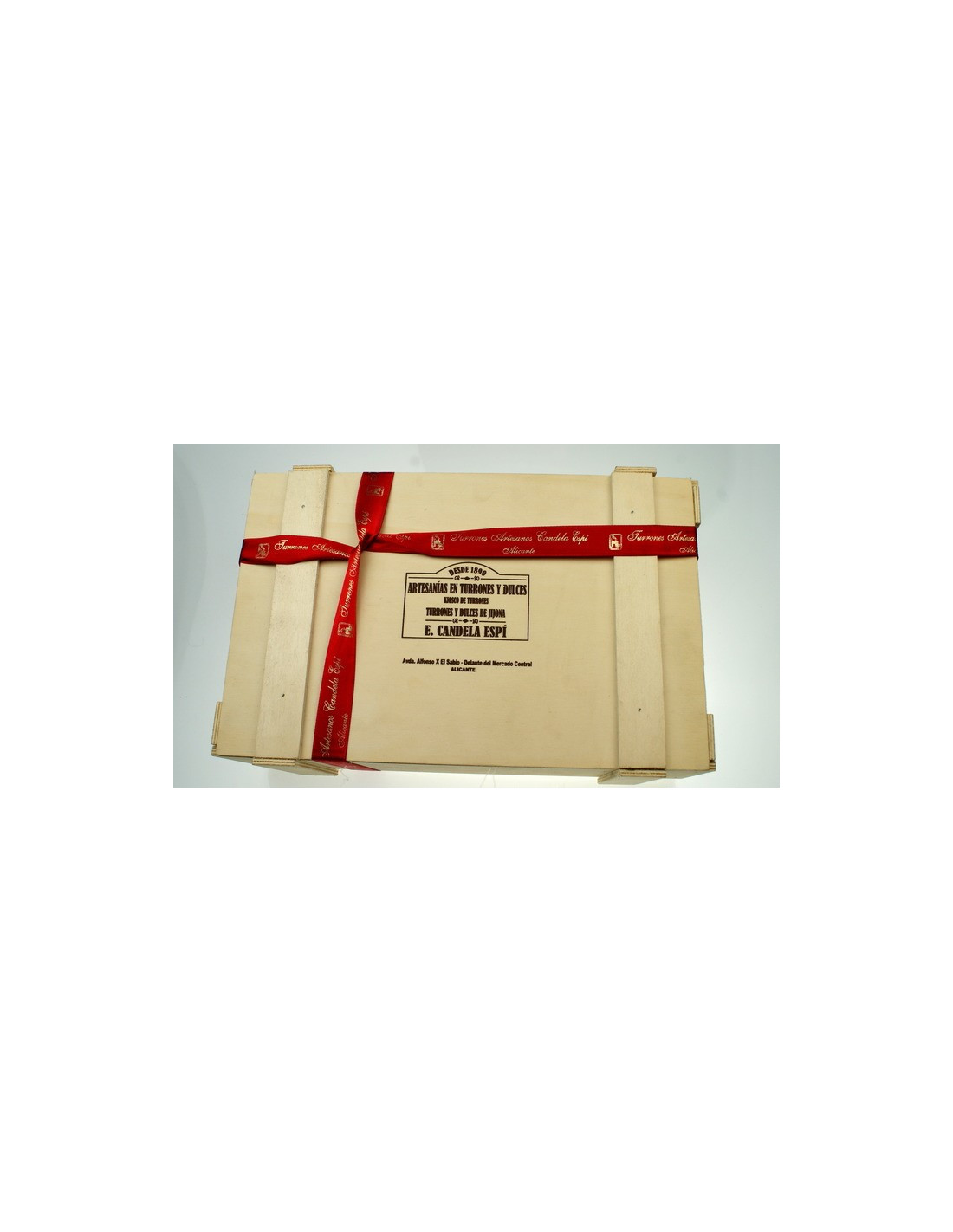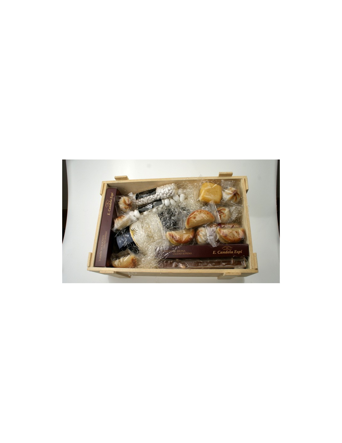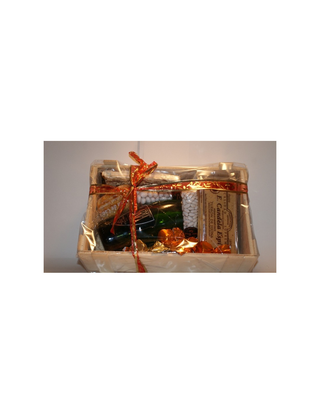Lote especial presentado en una caja de madera. Contenido: 1 pastilla de turron de Jijona de 300g. 1 pastilla de turron de Alicante de 300g. 1 pastilla de turron de chocolate con leche o puro 300g. 1 Pan de Cádiz artesanal 250g. 1 paquete de catalmendras de chocolate 150g. 1 paquete de peladillas de almendra marcona 100g. 1 botella de cava de 70cl , Surtido de mazapánes y Bombones rellenos de turron.