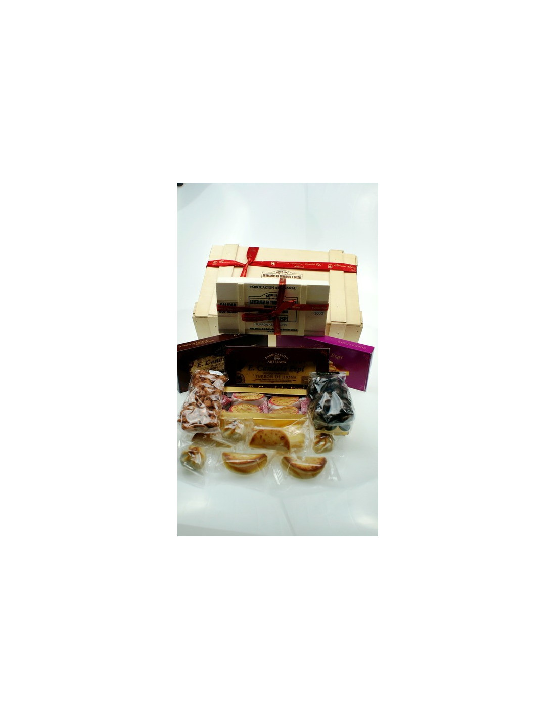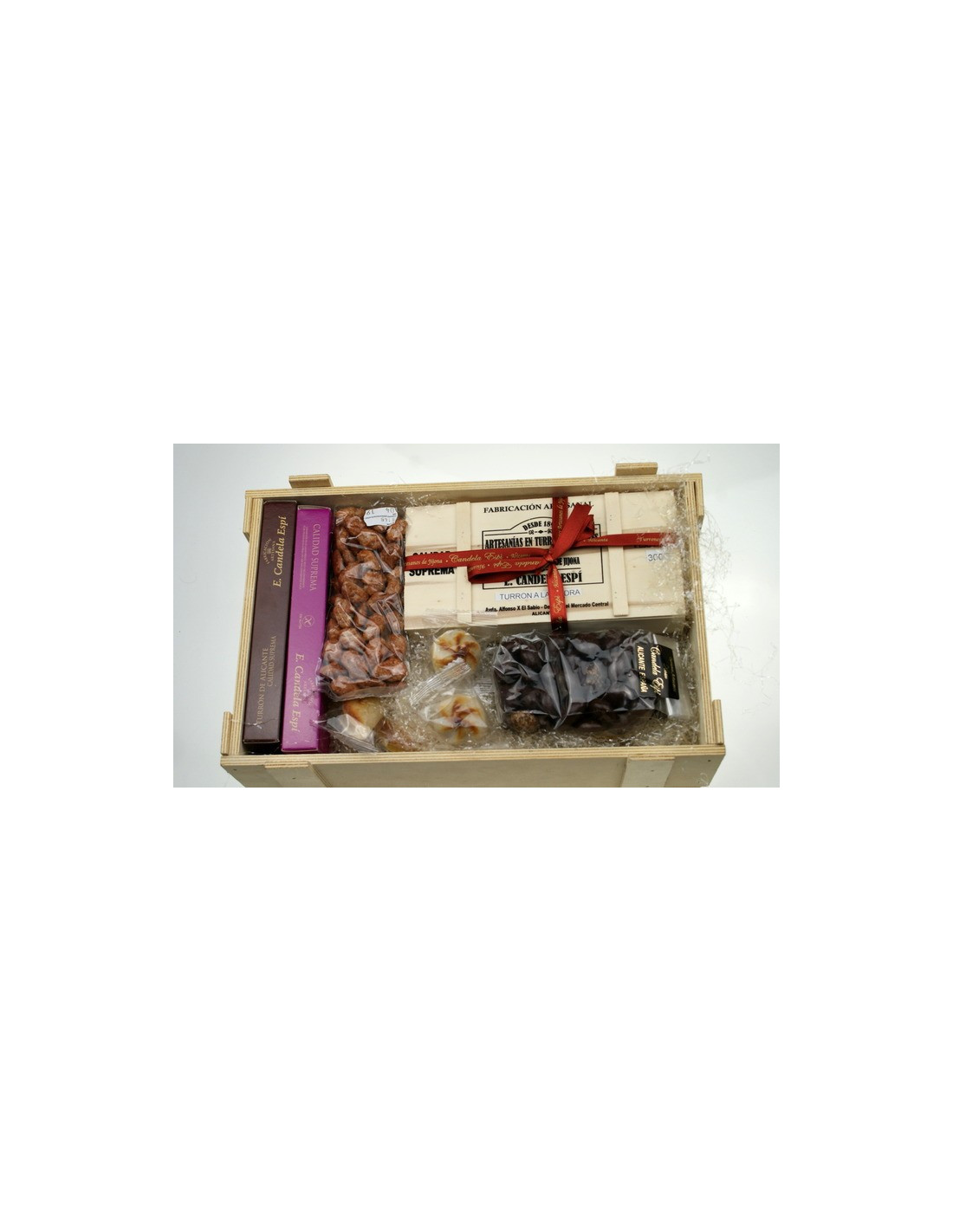 Caja de madera alistonada,benjamin: 1 turron a la piedra con caja de madera 300g. 1turron de Alicante 300 g. 1 turrón de yema tostada 300g. 1 turron de JIJONA 300g. 1 paquete de chocoperlas 150g. polvorones 250g., yemitas de jijona y suspiros de chocolate, Bombones rellenos de turrón,garrapiñadas de almendra,5 pasteles de gloria presentado envuelto en celofan con un lazo de decoracion.