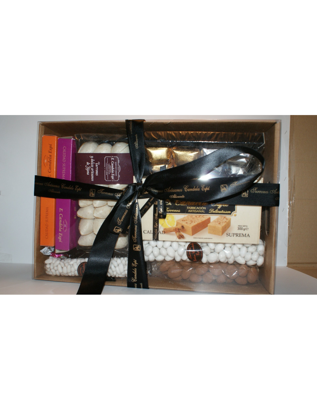 Lote especial artesania compuesto de: Turron a la piedra de en caja de madera 300g. Turron de Alicante artesano de 300g. Turron de chocolate con leche 300g. Turron de mazapán frutas 300g. 250g. pasteles de gloria y yema. 250g. de polvorones de almendra artesanos 250 g de almendras rellenas de turron a la piedra. peladillas almendra marcona 100g. piñones nacional 100g. almendra marcona a los 3 chocolates 140g. Bombones de turron y Bombones surtidos. Presentado en caja de carton con tapa de plastico y decorado con cinta negra y dorada.