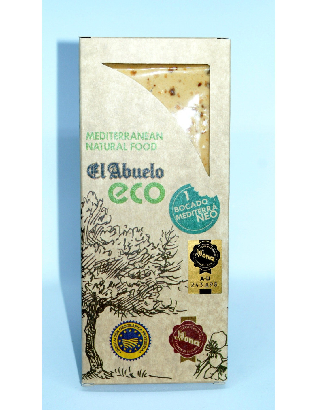 Ingredientes Almendra tostada (70%), miel (17%), azúcar de caña y albúmina de huevo. Todos los ingredientes procedentes de cultivo ecológico. Información Alérgenos y OGM Contiene almendra y huevo. Elaborado en una fábrica que utiliza: otros frutos de cáscara. No contiene OGM Información nutricional media por 100g Valor energético: 2320 kJ / 558 kCal; Grasas: 40g; De las cuales saturadas: 3.6g; Hidratos de Carbono: 34g; De los cuales azúcares: 32g; Fibra alimentaria: 6.1g; Proteínas: 14g; Sal: 0g; (Referencia bibliográfica)