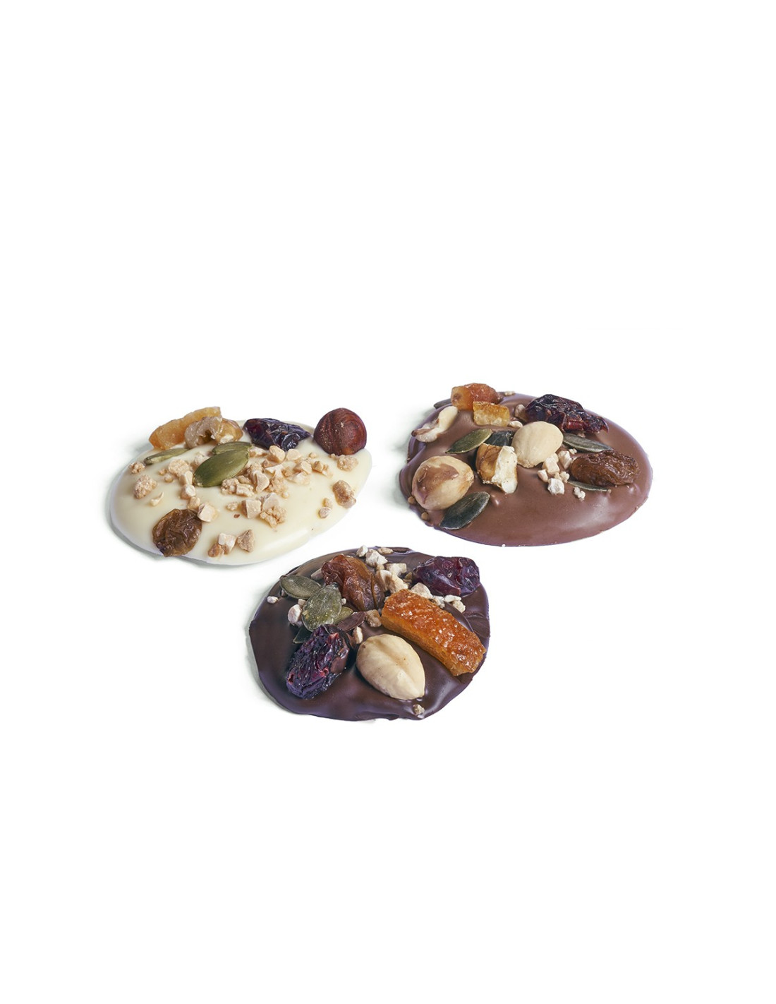 83% Chocolat blanc : (sucre, beurre de cacao, poudre de lait, émulsifiant : Lécithine de soja et arôme) 17% Fruits à coque : raisins secs, amandes caramélisées, graines de citrouille, graines de tournesol et noix. Cubes d'orange.
