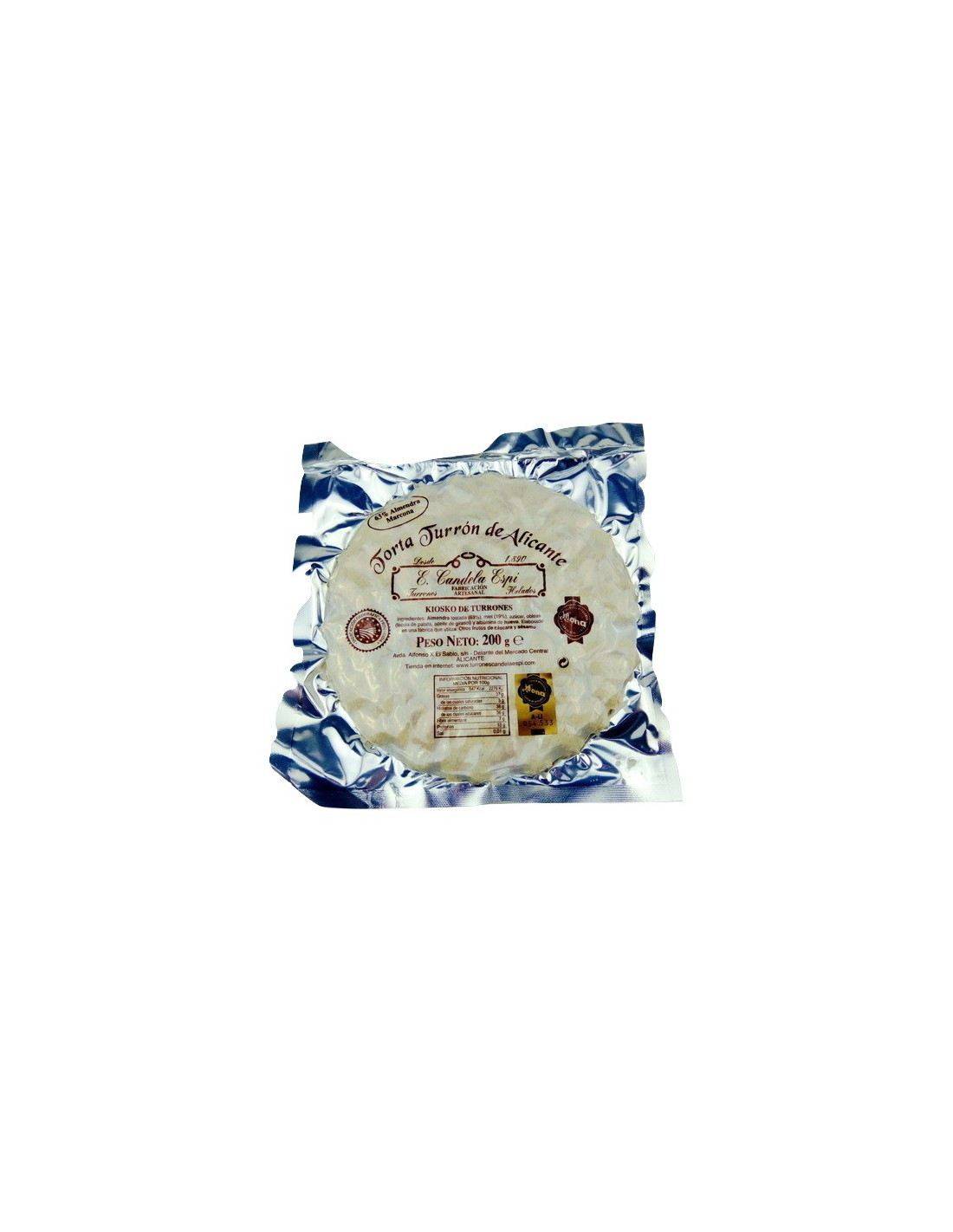 Gâteau traditionnel turron d’Alicante à base d’amande Marcona 63%, miel de romarin NATUREL 17%, sucre, blanc d’œuf et gaufrette à la surface (fécule de pomme de terre, huile de tournesol.